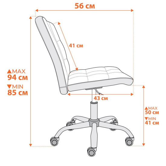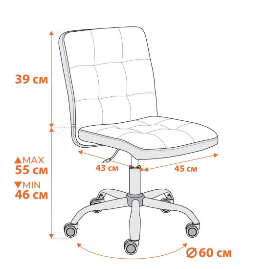 Кресло FIESTA — идеальное сочетание комфорта, функциональности и современного дизайна. Это кресло станет отличным выбором для тех, кто проводит много времени за компьютером, обеспечивая настоящую поддержку и удобство. Ключевые особенности кресла FIESTA: - Устойчивость и надежность. Прочная 5-лучевая стальная хромированная крестовина (диаметр 600 мм) обеспечивает высокую устойчивость, а ролики с полиуретановым напылением защищают ваше напольное покрытие от повреждений, что делает кресло подходящим для паркета и ламината. - Регулируемая высота. Сиденье из фанеры (10 мм) и спинка с металлическим каркасом, наполненная ППУ плотностью не менее 30 кг/м³, обеспечивают оптимальную поддержку и комфорт даже при длительном использовании. - Качественная обивка. Обивка из флока (плотность 320 г/м²) с водоотталкивающей пропиткой придает креслу презентабельный вид и защищает его от загрязнений. Этот материал долговечен, легко чистится и обеспечивает хороший воздухообмен - Современный дизайн. Стильное оформление кресла сделает его отличным дополнением к любому интерьеру, добавляя уют и элегантность в ваш дом или офис. Дополнительные характеристики: - Максимальная нагрузка: 100 кг. - Сборка. Кресло поставляется в разобранном виде, комплектуется простой инструкцией для сборки. Кресло FIESTA — ваш надежный помощник для комфортной работы и отдыха в любое время.