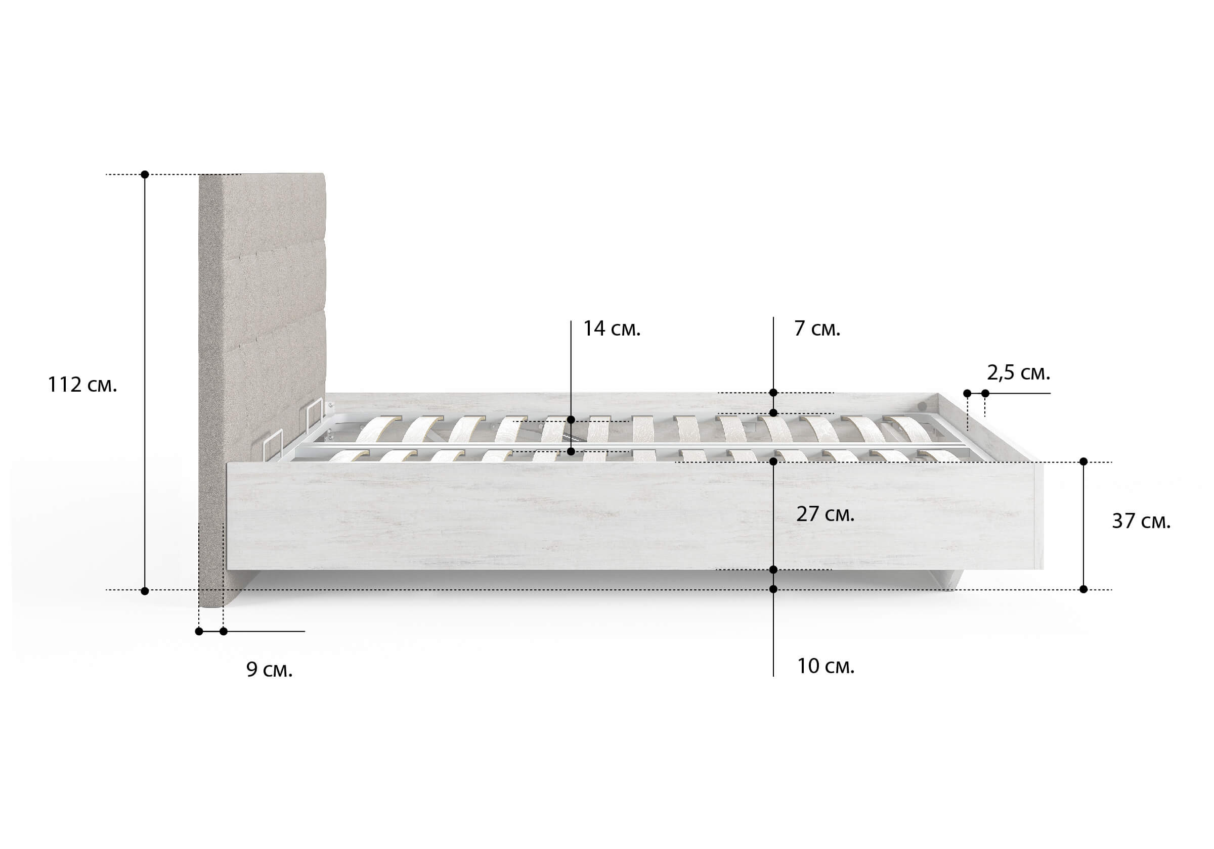 Царги из ЛДСП увеличенной толщины придадут строгость и надежность. Благодаря сочетанию усиленных металлических уголков, ребер жесткости и эксцентриковой стяжке конструктив кровати получается жёстким и прочным.- Ширина —90