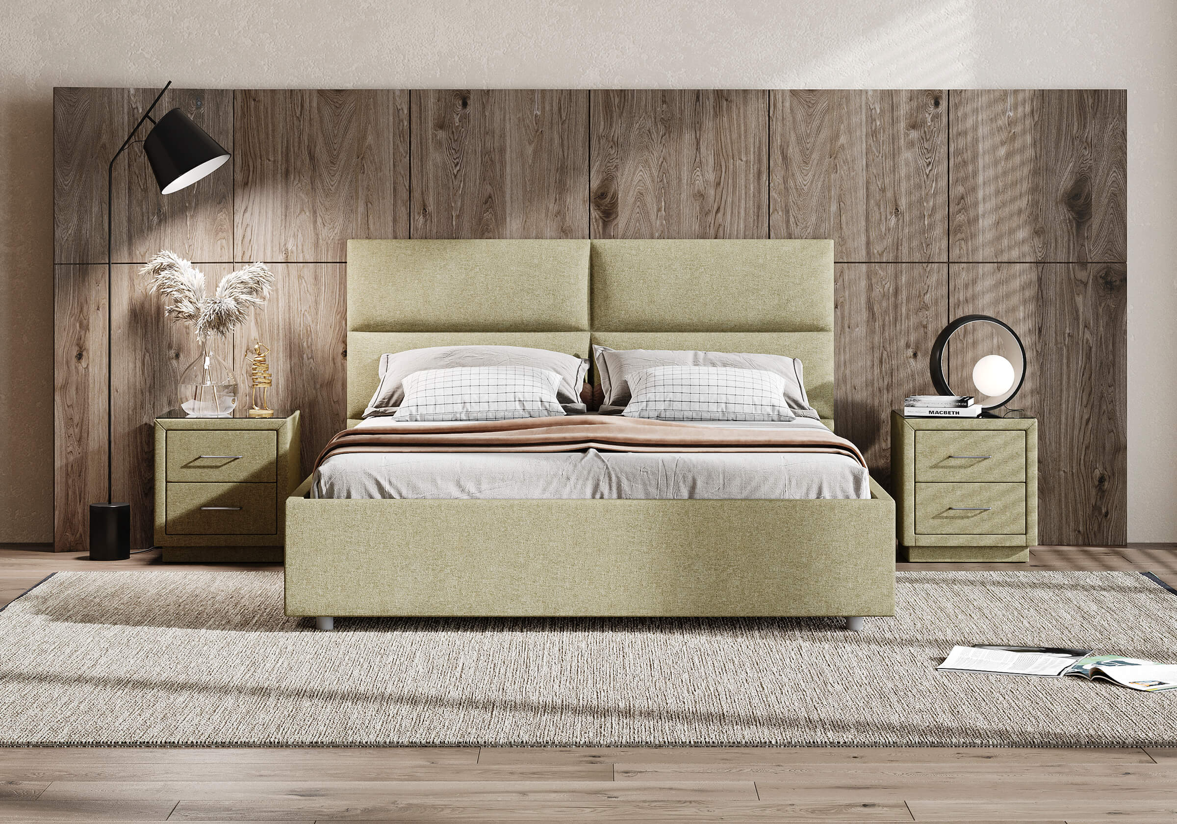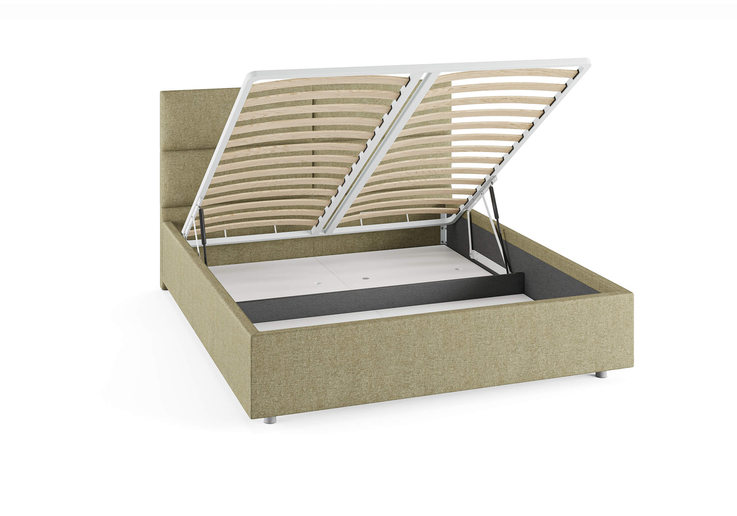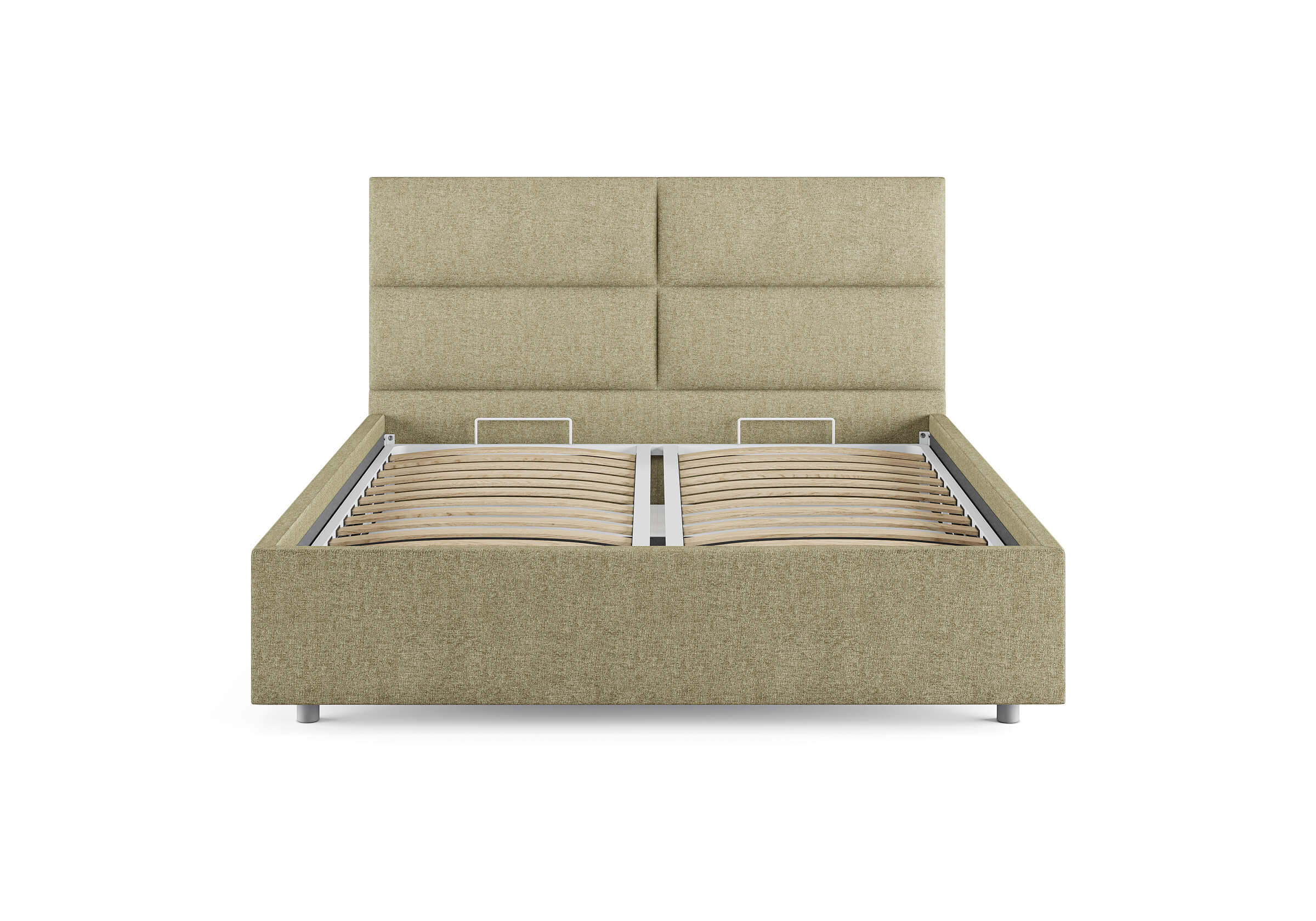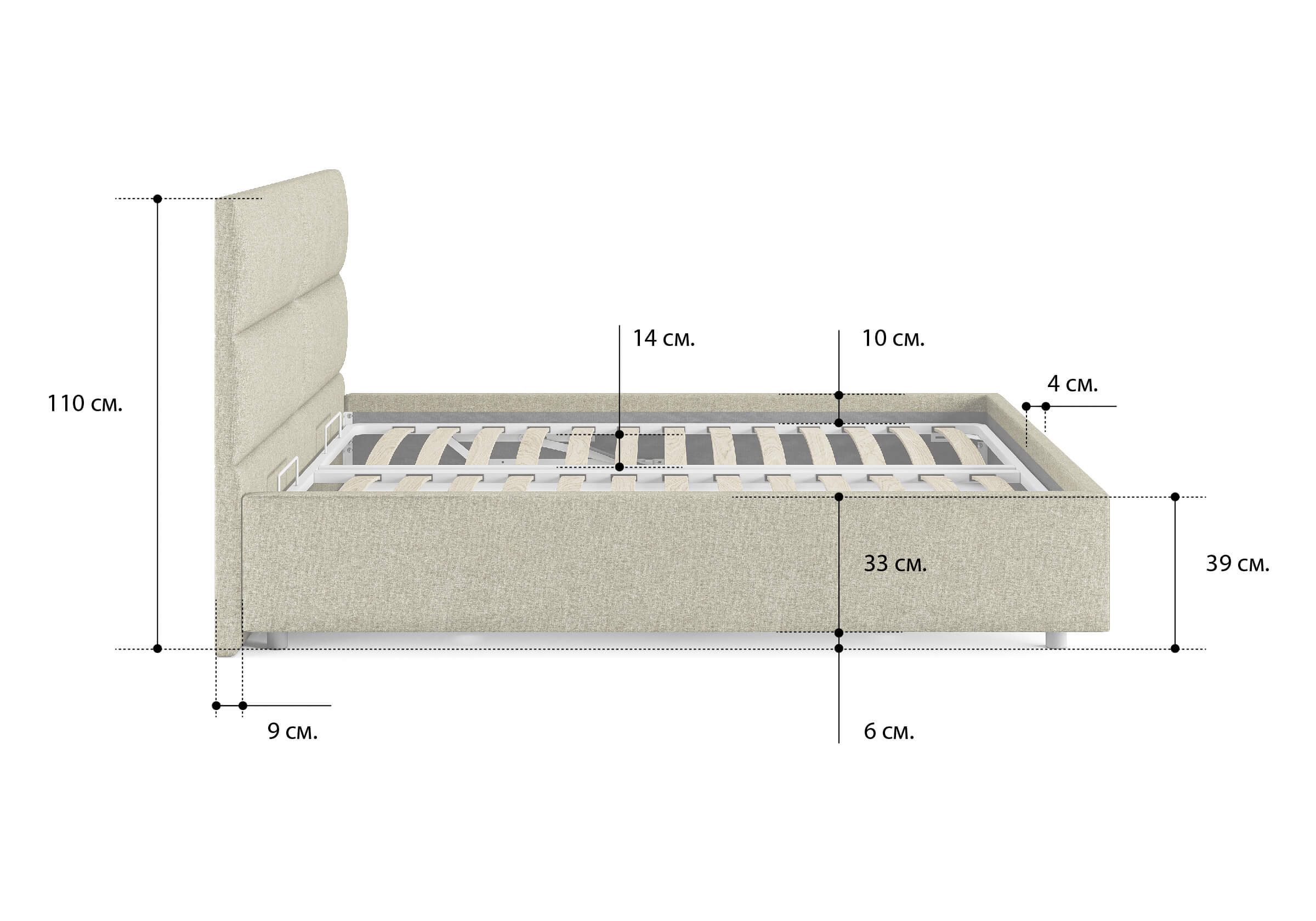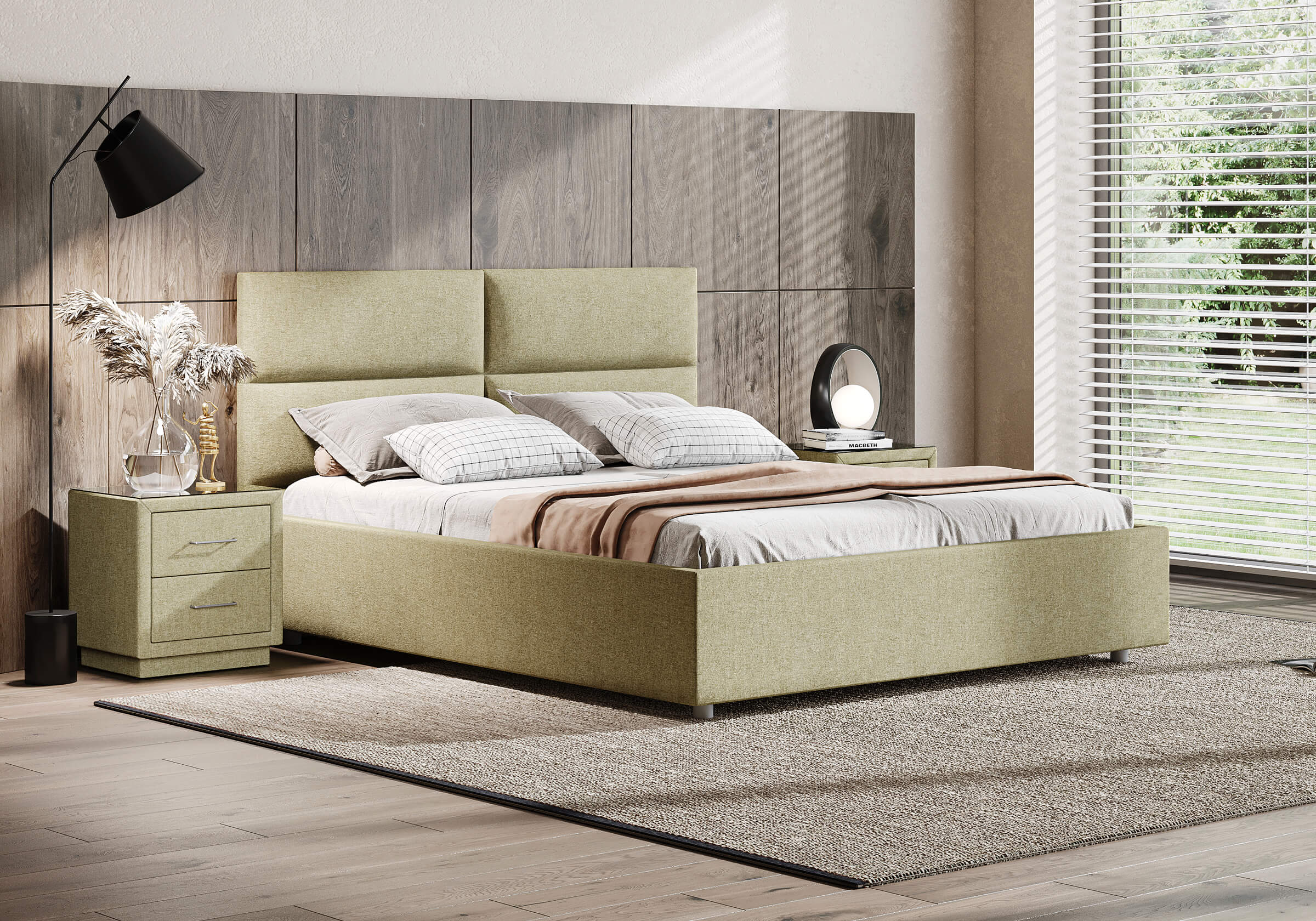 Лаконичная модель с изголовьем из объемных прямоугольников, сшитых между собой. Царги кровати выполняются по технологии съемного чехла. Модель изготовлена из ДСП. Обратная сторона изголовья обита спандбондом, но, при желании, её можно выполнить из основного обивочного материала. При необходимости кровать может быть укомплектована разборным или неразборным металлическим основанием с ламелями, подъемным механизмом с бельевым ящиком, трансформируемым основанием Aquarius (размером 160-200).