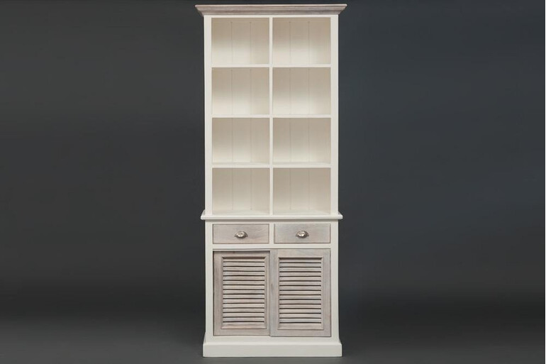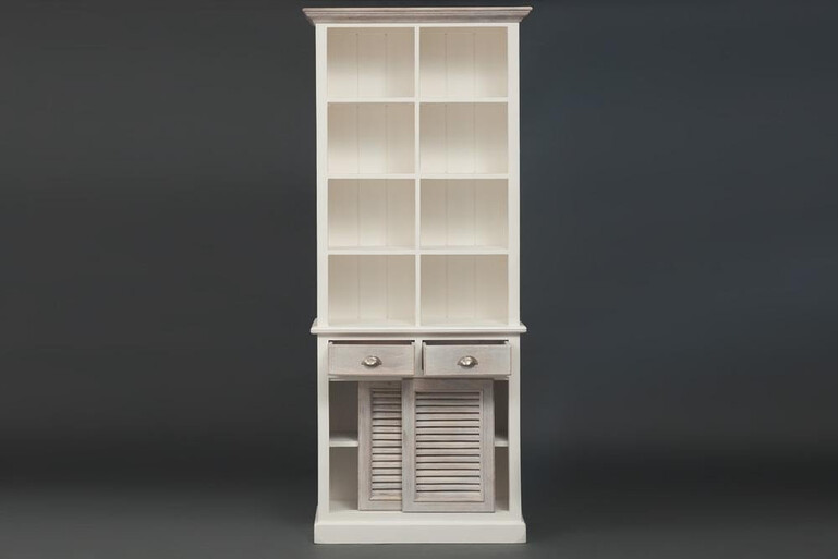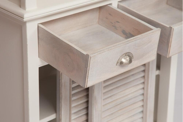 Изделие выполнено из массива дерева манго. Коллекция «Riviera» отличается красивой комбинацией цвета: белый цвет и натуральное дерево с техникой white wash. Фактура состаренной натуральной древесины видна по всем поверхностям изделия. Ручки с латунной отделкой прикручены старинными шурупами с прямым шпицем. В шкафу 4 открытые полки, 2 выдвижных ящика. Нижние дверцы слайдеры сделаны в виде знаменитых средиземноморских ставен. Идеальный вариант для ценителей стильной мебели!