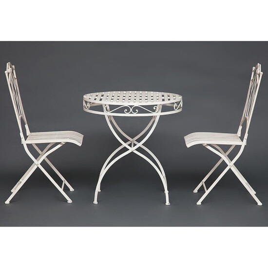Изысканный комплект кованой мебели Secret De Maison PALLADIO из коллекции BEAUJOLAIS, состоящий из стола и двух складных стульев, будет прекрасно смотреться в тенистом уголке сада, на веранде кафе, отлично подойдёт для отдыха на приусадебной лужайке. Высокое качество и красота неповторимых ажурных узоров столешницы и спинок стульев добавит благородства в ваш ландшафтный дизайн, подчеркнет вкус и статус своего владельца. Устойчивый стол и два удобных складных стула выполнены из стального сплава с напылением краски, небольшие потертости и признаки старины подчеркивают неповторимый облик изделий. Стулья легко складываются и раскладываются, не занимают много места при хранении. Эта функциональная, прочная и красивая мебель займет важное место в оформлении вашего сада. Комплект устойчив к любым погодным условиям и будет радовать вас долгие годы своим первоначальным видом. Изделия прекрасно сочетаются с мебелью из коллекции BEAUJOLAIS, поставляются в разобранном виде.