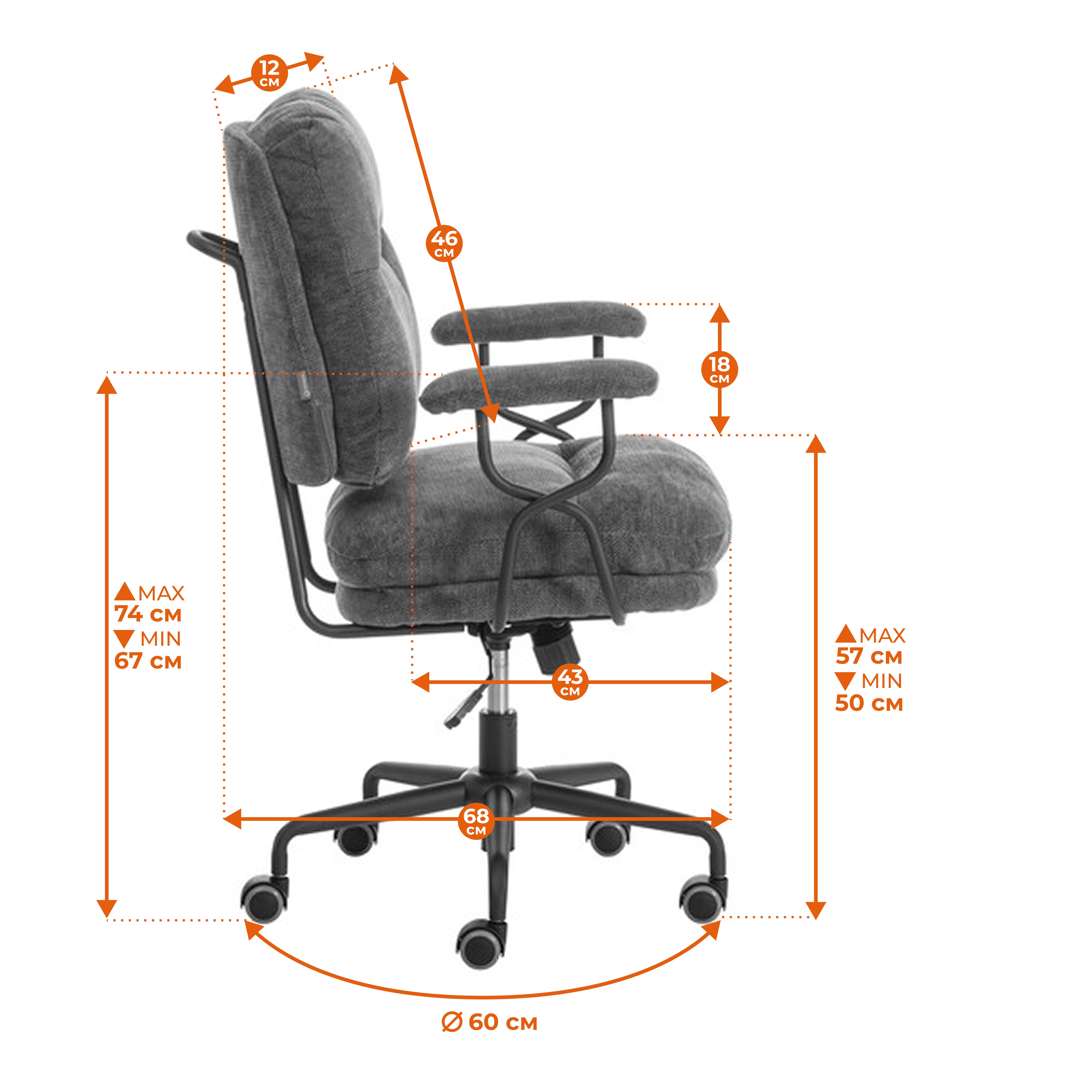 Фиксированные подлокотники: Металлические подлокотники с мягкими накладками обеспечивают комфортную поддержку рук. Размер накладки на подлокотники: длина 28,5 ширина 9 см, высота 4 см.