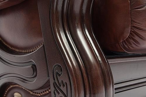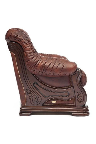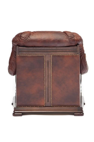 Основание изготовлено из натурального дуба ручной резки. Красивая текстура натурального дерева. Кресло декорировано металлическими заклепками с медным напылением под старину.