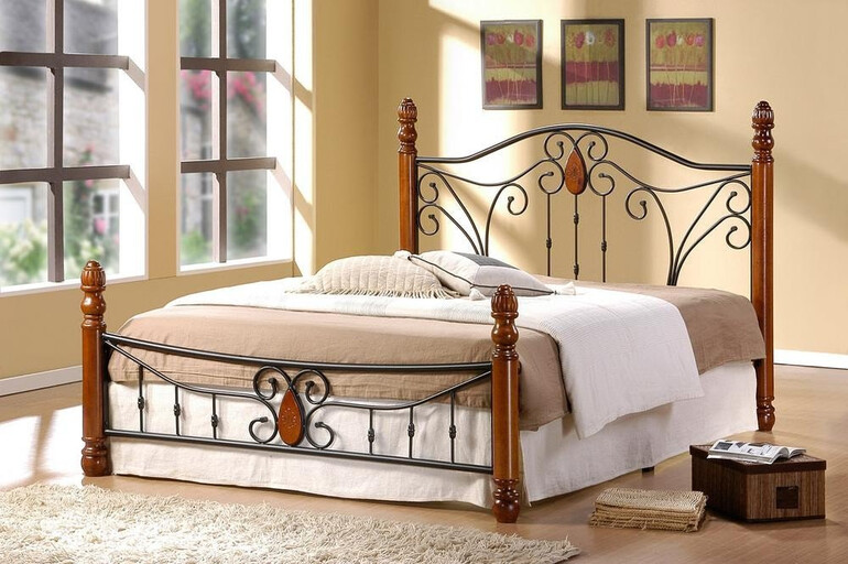 Кровать украшена резной спинкой, а металлические прутья изящно сочетаются с деревянными колоннами. Металлический каркас кровати гарантирует высокую прочность, а гевея (каучуковое дерево), использованная при изготовлении кровати, значительно увеличивает эксплуатационный срок. Это дерево не впитывает запахи и влагу.