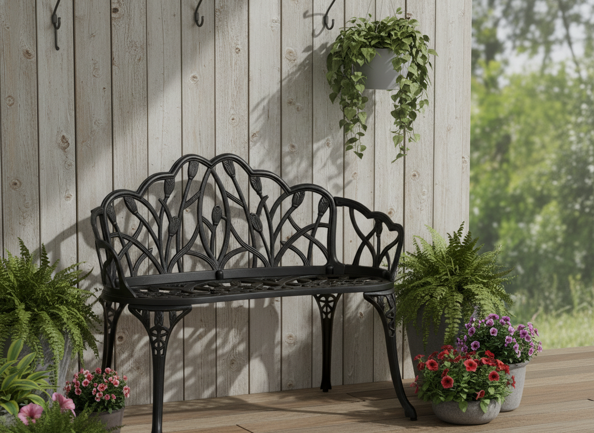 Уникальные кованые цветочные узоры, напоминающие тонкое кружево, придают модели особую декоративность и шарм. В сочетании с прочным каркасом из литого алюминия скамья выглядит дорого и элегантно, гармонично вписываясь как в классический, так и в современный ландшафтный дизайн.