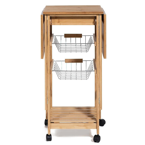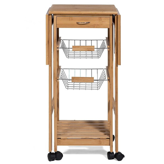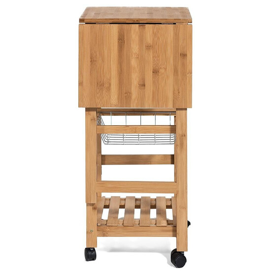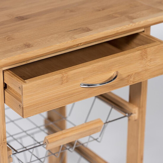 Коллекция «Экостиль» представляет легкие, прочные, изделия из натурального прессованного бамбука, с красивой фактурой, полностью экологичные, не подверженные влаге, для кухни, ванной и жилых комнат. Столик передвижной кухонный разделочный на колесиках, трансформируемый в стол, с ящиком и двумя металлическими выдвижными полками. Материал: прессованный бамбук, поставляется 1 шт. в 1 кор.; объем 0,05 м3.