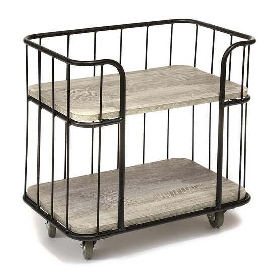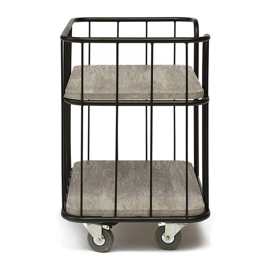 На колёсиках. Материал: каркас - металл, столашницы - дерево гевея. Цвет: основание - чёрный, столешницы - коричневый. Размеры: 62х41х61,5 см