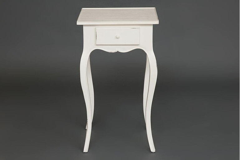 Небольшой изысканный столик Secret De Maison ANTOINETTE из коллекции VERSAILLES на четырех элегантных ножках выполнен в стиле прованс. Качественная ручная работа, изогнутые ножки, декорированные резными деталями и изящными узорами ручной работы, подчеркивают красоту и благородство изделия. Небольшие потертости, царапины и облупившаяся краска придают изысканность и особенный лоск. Выдвижной ящик небольшого размера удобен для хранения украшений и других мелочей. Столик изготовлен из массива красного дерева, покрытие краской и натуральным маслом подчеркивает природную красоту древесины. Обработанное по данной технологии дерево обладает повышенной прочностью, долговечностью и не требует специального ухода. Модель идеально сочетается с мебелью из коллекции VERSAILLES, поставляется в собранном виде.