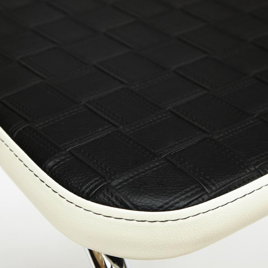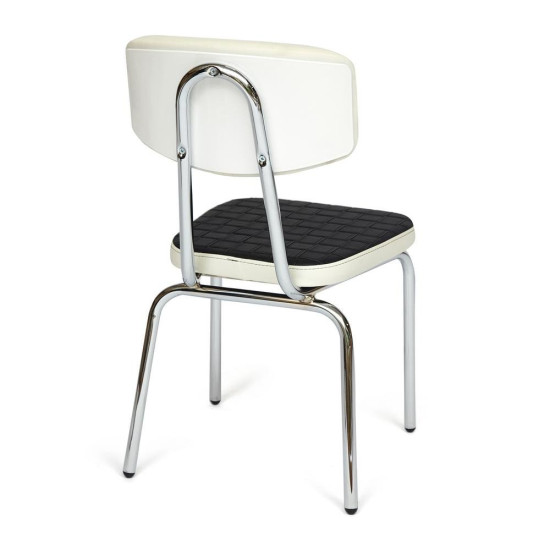 Стул с мягким сиденьем и спинкой из экокожи с имитацией плетения на хромированном металлическом каркасе.
