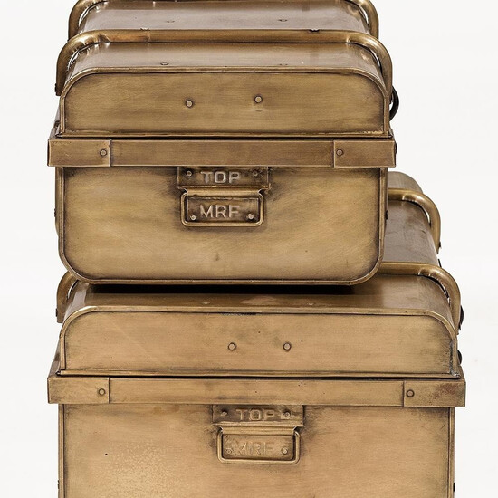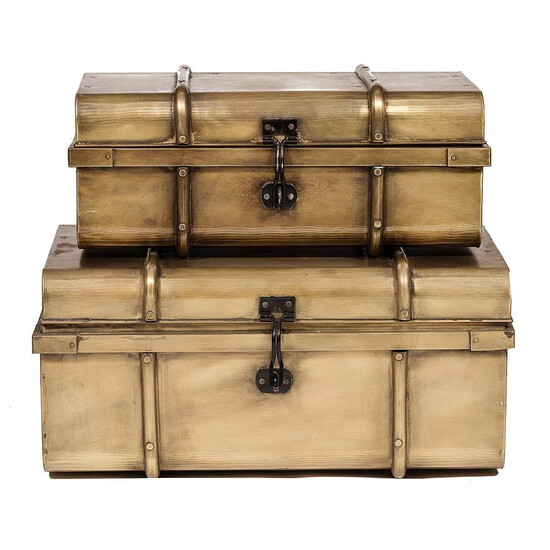 Коллекция «Loft Art» и «Loft Soft» от Secret de Maison представляет мебель из натурального палисандра и дерева манго, с элементами ковки, кожи буйвола, винтажных хлопковых тканей. Набор сундуков из 2 штук Secret De Maison Hammer - из металла с отделкой под латунь, копия ретро чемодана начала 20 века. Поставляется в 1 коробке. Объем: 0, 12м3