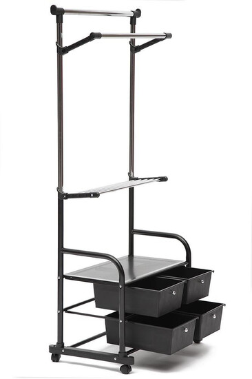 Вешалка для гардеробной комнаты, двойная, раздвижная по высоте, с полками и ящиками для одежды и обуви, на колесиках.